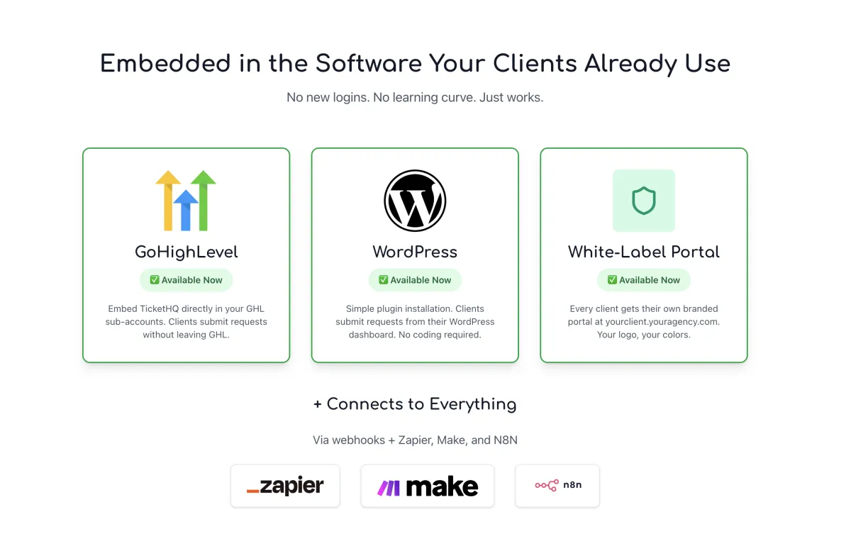 Right inside GoHighLevel or WordPress. No new login. No learning curve. They click "Submit Request" in the software they use every day.